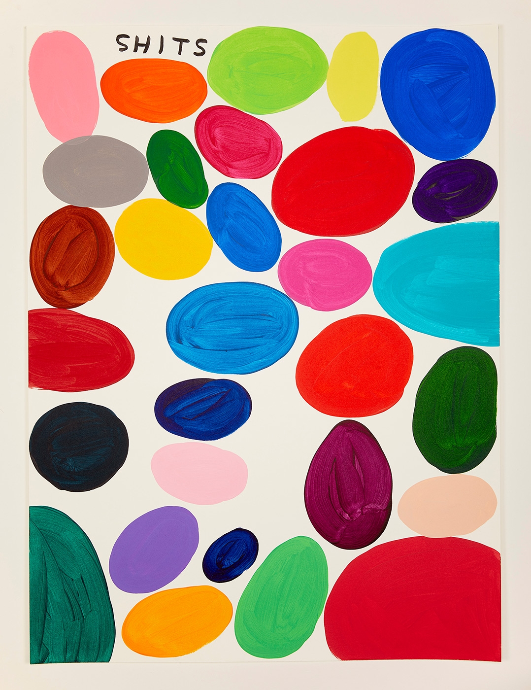 Hand-painted by the artist in his Brighton studio, 'Shits' is a new limited edition multiple consisting of 125 unique variations of a single image. David Shrigley's distinctive drawing style imbued with dry humour cuts to the point of human nature, making satirical comments on everyday situations and human interactions. Recurring themes pervade his story telling, capturing child-like views of the world; the perspective of aliens and monsters or the compulsive habits of an eavesdropper shouting out loud. His simple, verging-on-juvenile drawings annotated with his distinctive scrawling handwriting hold up a sardonic mirror which somehow generates flashes of profound clarity.