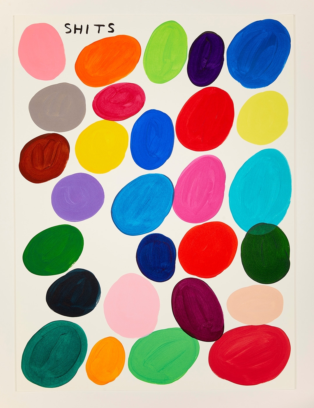 Hand-painted by the artist in his Brighton studio, 'Shits' is a new limited edition multiple consisting of 125 unique variations of a single image. David Shrigley's distinctive drawing style imbued with dry humour cuts to the point of human nature, making satirical comments on everyday situations and human interactions. Recurring themes pervade his story telling, capturing child-like views of the world; the perspective of aliens and monsters or the compulsive habits of an eavesdropper shouting out loud. His simple, verging-on-juvenile drawings annotated with his distinctive scrawling handwriting hold up a sardonic mirror which somehow generates flashes of profound clarity.