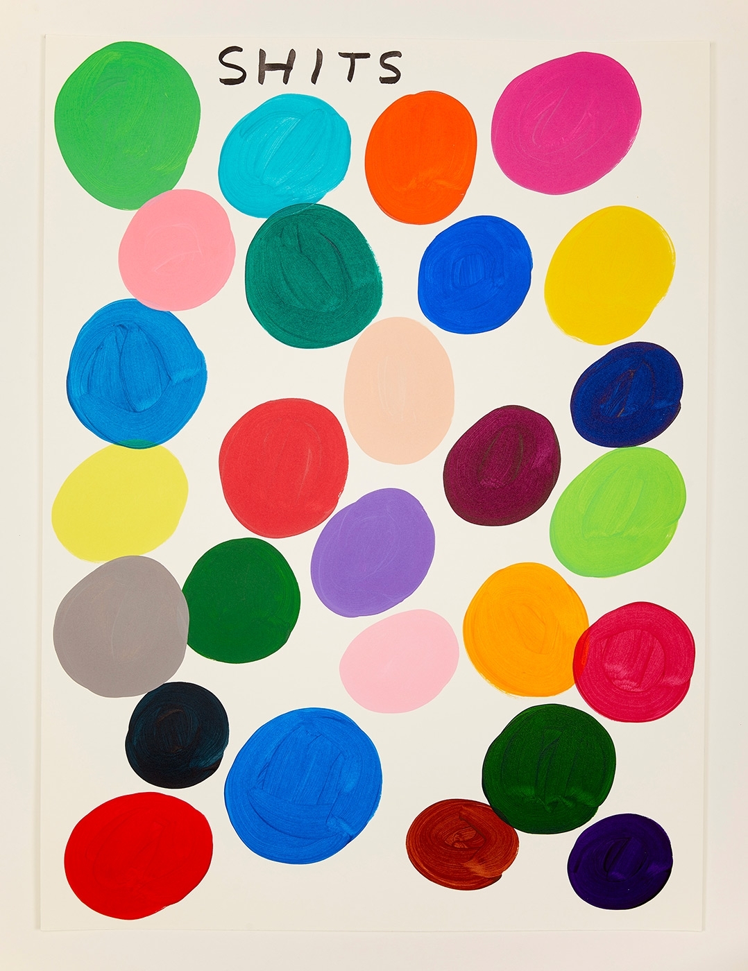 Hand-painted by the artist in his Brighton studio, 'Shits' is a new limited edition multiple consisting of 125 unique variations of a single image. David Shrigley's distinctive drawing style imbued with dry humour cuts to the point of human nature, making satirical comments on everyday situations and human interactions. Recurring themes pervade his story telling, capturing child-like views of the world; the perspective of aliens and monsters or the compulsive habits of an eavesdropper shouting out loud. His simple, verging-on-juvenile drawings annotated with his distinctive scrawling handwriting hold up a sardonic mirror which somehow generates flashes of profound clarity.