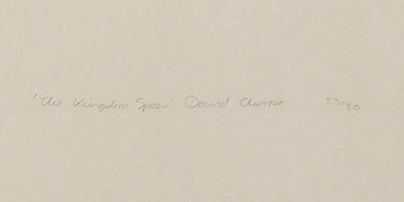 Hand coloured hard ground etching on grey arches paper. Produced by Thumbprint Press, London.