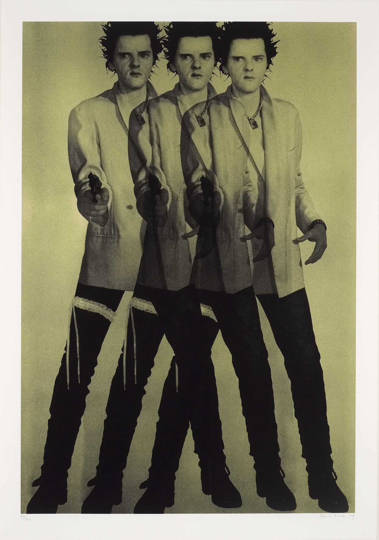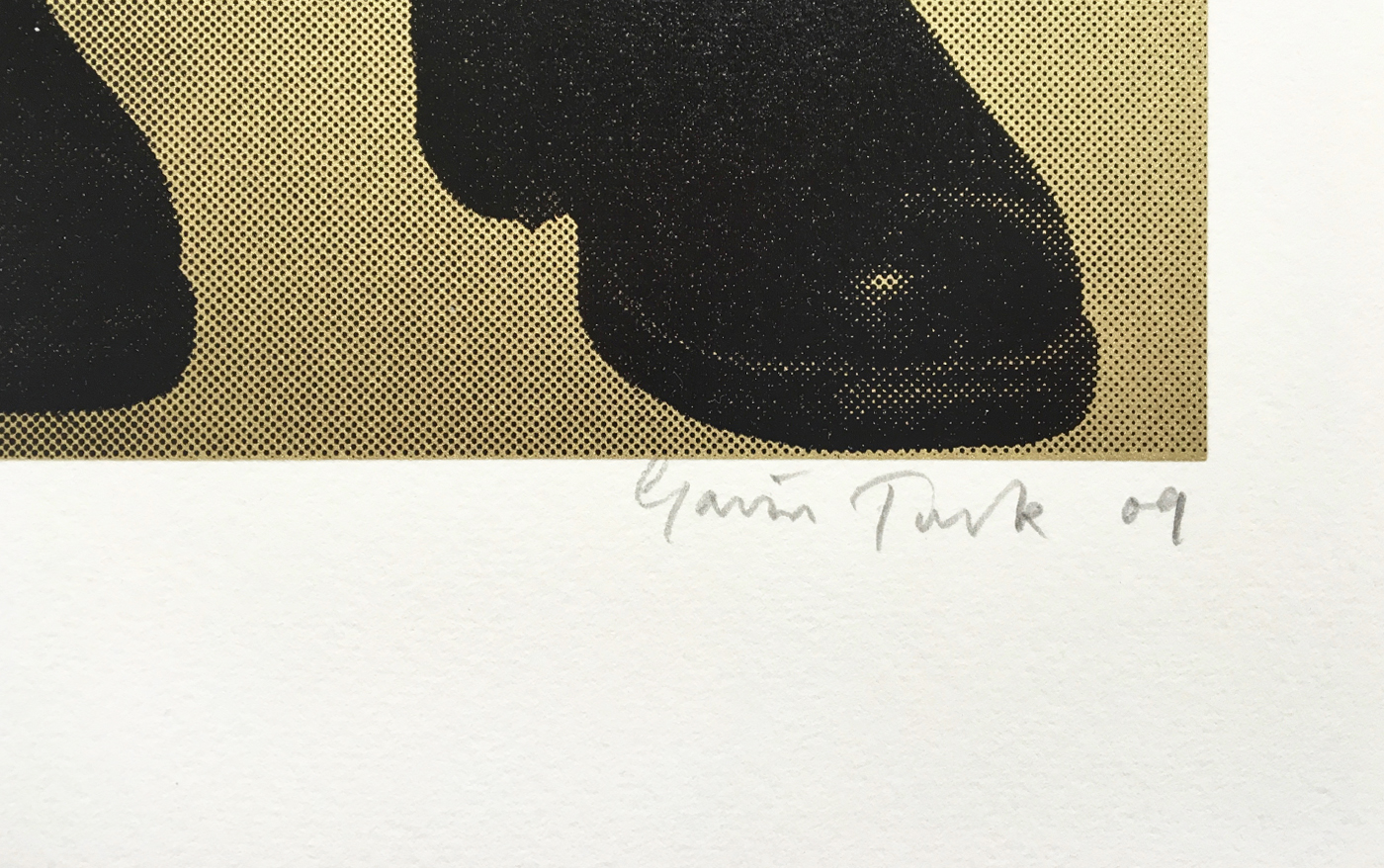 'Gold Triple Pop' (2009) registers the reverberations of history surrounding Turk's own iconic wax-work sculpture Pop (1993) - Gavin Turk as Sid Vicious as Elvis Presley. Layers of meaning, interpretation and misinterpretation are the fate of a work like Pop (1993) which has been endlessly reproduced and is held up as a key moment in the history of the so called 'YBAs'. The black overlapping repeated figures in 'Gold Triple Pop' suggest a fractured, hall of mirrors version of history, while the gold background, though partially submerged below the black, is still visible and gives an alluring shimmer to the work.