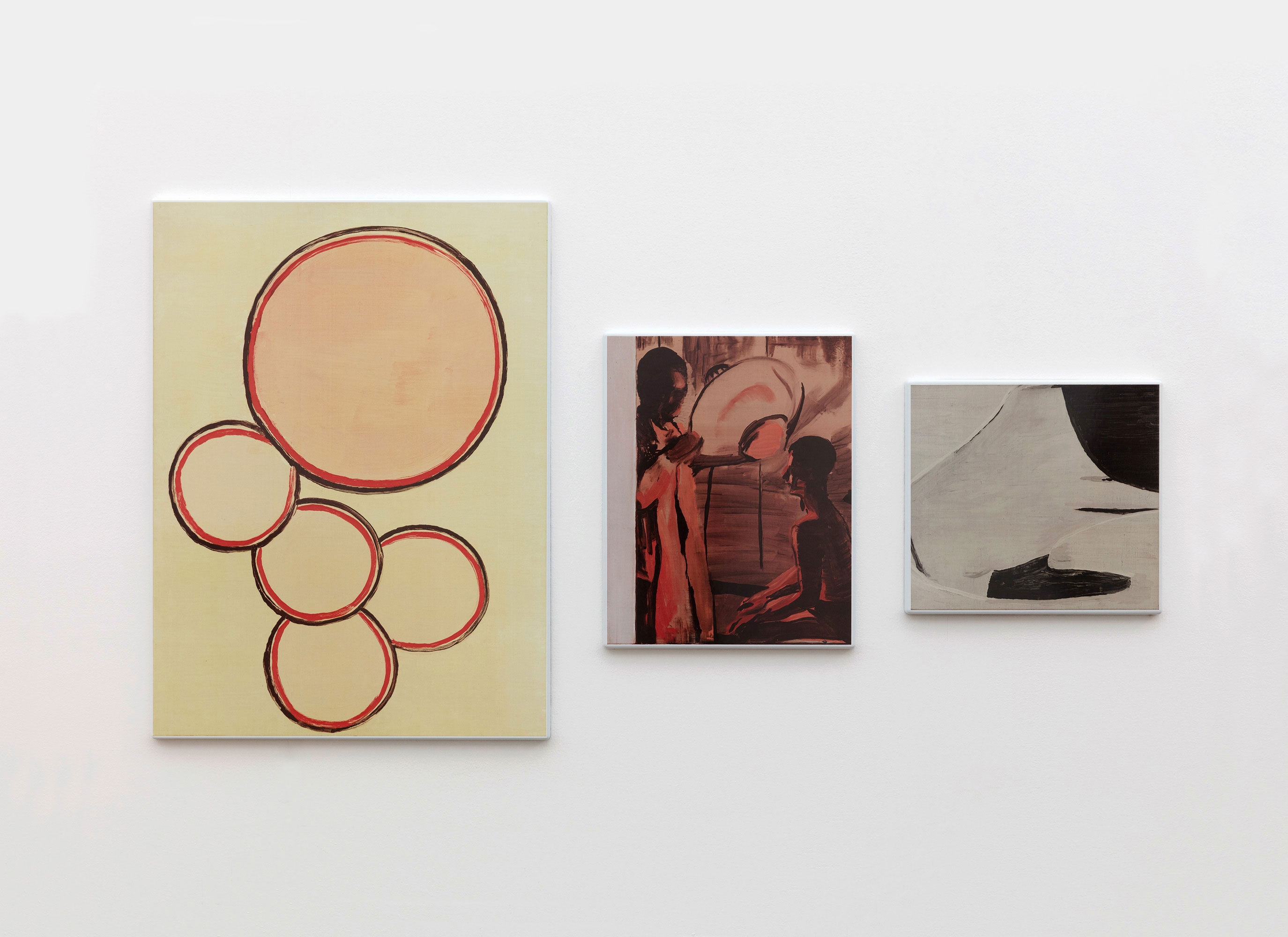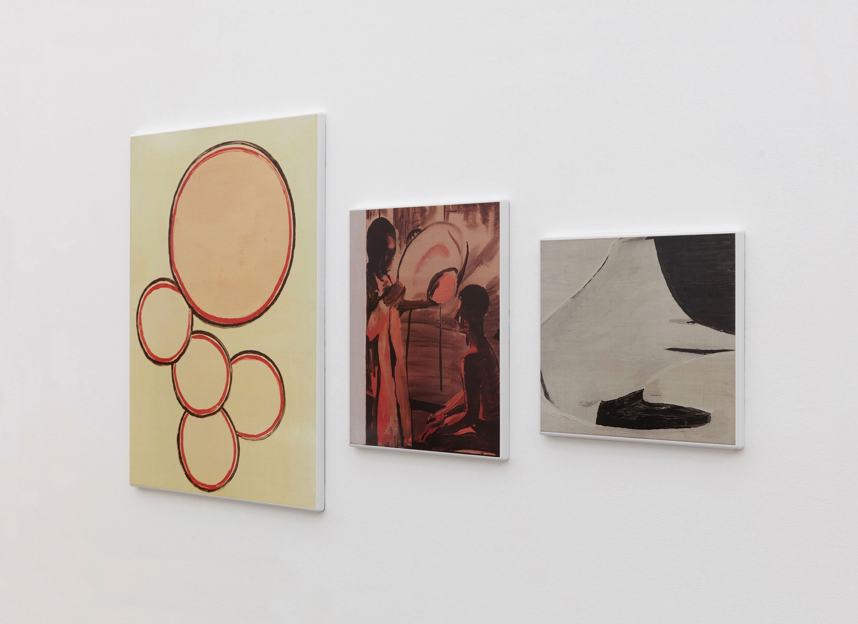 'Heillicht' was originally created in 1991 as a tryptich on canvas (now in the Mu.ZEE museum collection, Ostend, Belgium) with the 3 parts titled 'Smell, 'Heillicht' and ‘Incest'. They weren’t initially conceived as one work but Tuymans has noted that: 'Because of their colour, their brightness, their radiance, they later became one work. The first picture, Smell, is based on the deodorant blocks you find in toilets. It deals with smell, an abstraction. The large and small circles represent the diffusion of the smell. Smell has the property of having a particularly strong effect on the memory, without any need for pictures. The second picture is called Heillicht. A half-naked boy is being radiated with a lamp to cure him, to warm him and at the same time to let him feel the power of light. I am referring to the idea that science should change everything, that it’s always capable of everything. The last picture, Incest, is the abstraction of a hand sticking through something. It has to do with an intention. You just see the finger. The hand creates a sense of danger. At the same time there is an impression of something forbidden, something incestuous.’