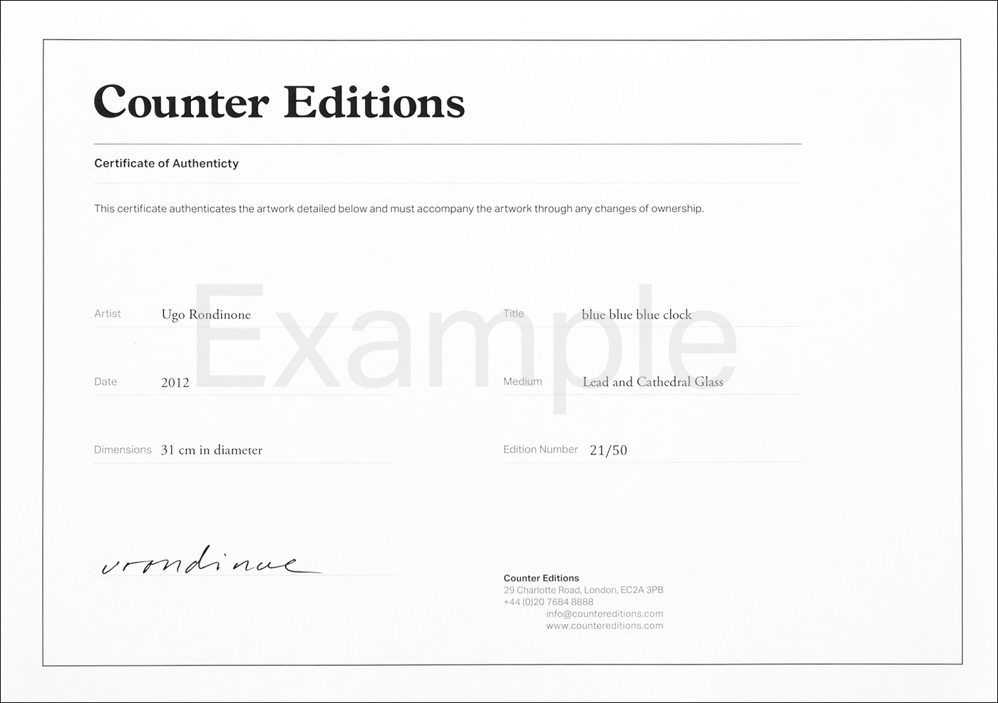 Themes of time passing and of personal reflection, of mortality and finitude, are typical of Rondinone's work; but 'blue blue blue clock' offers more than just melancholy meditation on life's transience. Rather it inspires to re-consider our conception of time and, as it is intended to be hung in a window and illuminated by natural light, alludes to the pre-digital age, when the passing of the sun across the sky was the only way to track time's passage.