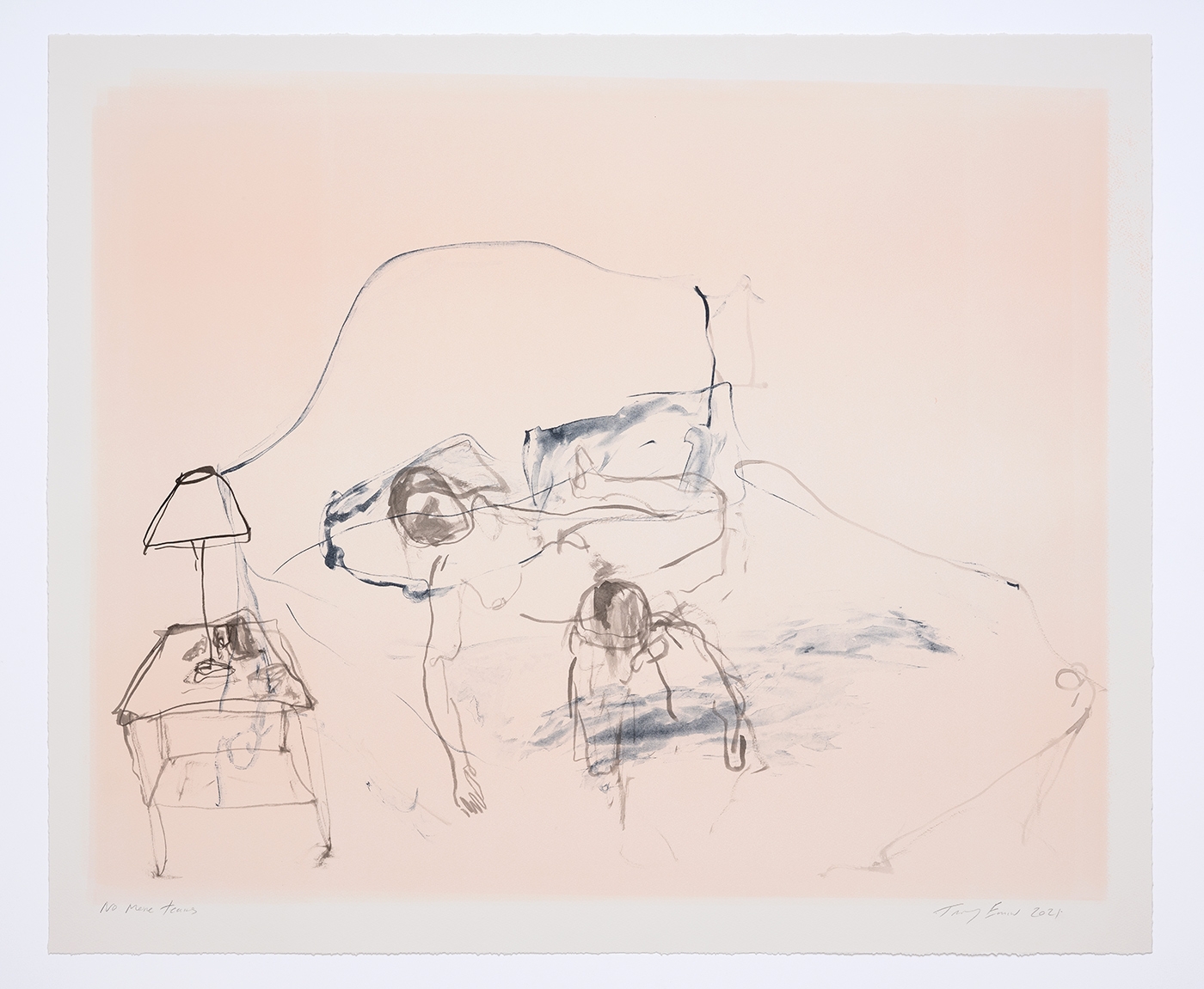For this new ongoing series, Tracey Emin returns to one of her most iconic motifs - the bed. Each print shares the same lithographic background image - a hesitant outline of a bed - onto each of which Emin has added a unique figurative drawing in India ink. Together the works make up a sequence of intimate bedroom scenes, some featuring a single figure, others a couple, with the fluid and intense mark-making conveying moments of intense emotional being.