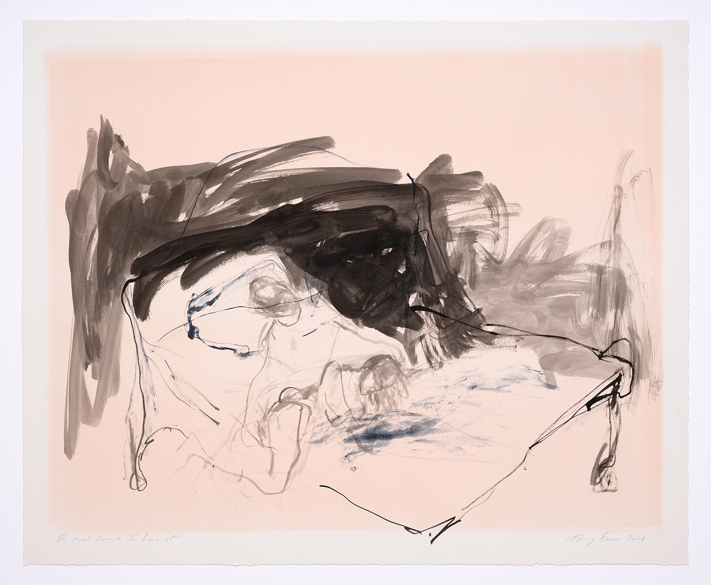For this new ongoing series, Tracey Emin returns to one of her most iconic motifs - the bed. Each print shares the same lithographic background image - a hesitant outline of a bed - onto each of which Emin has added a unique figurative drawing in India ink. Together the works make up a sequence of intimate bedroom scenes, some featuring a single figure, others a couple, with the fluid and intense mark-making conveying moments of intense emotional being.