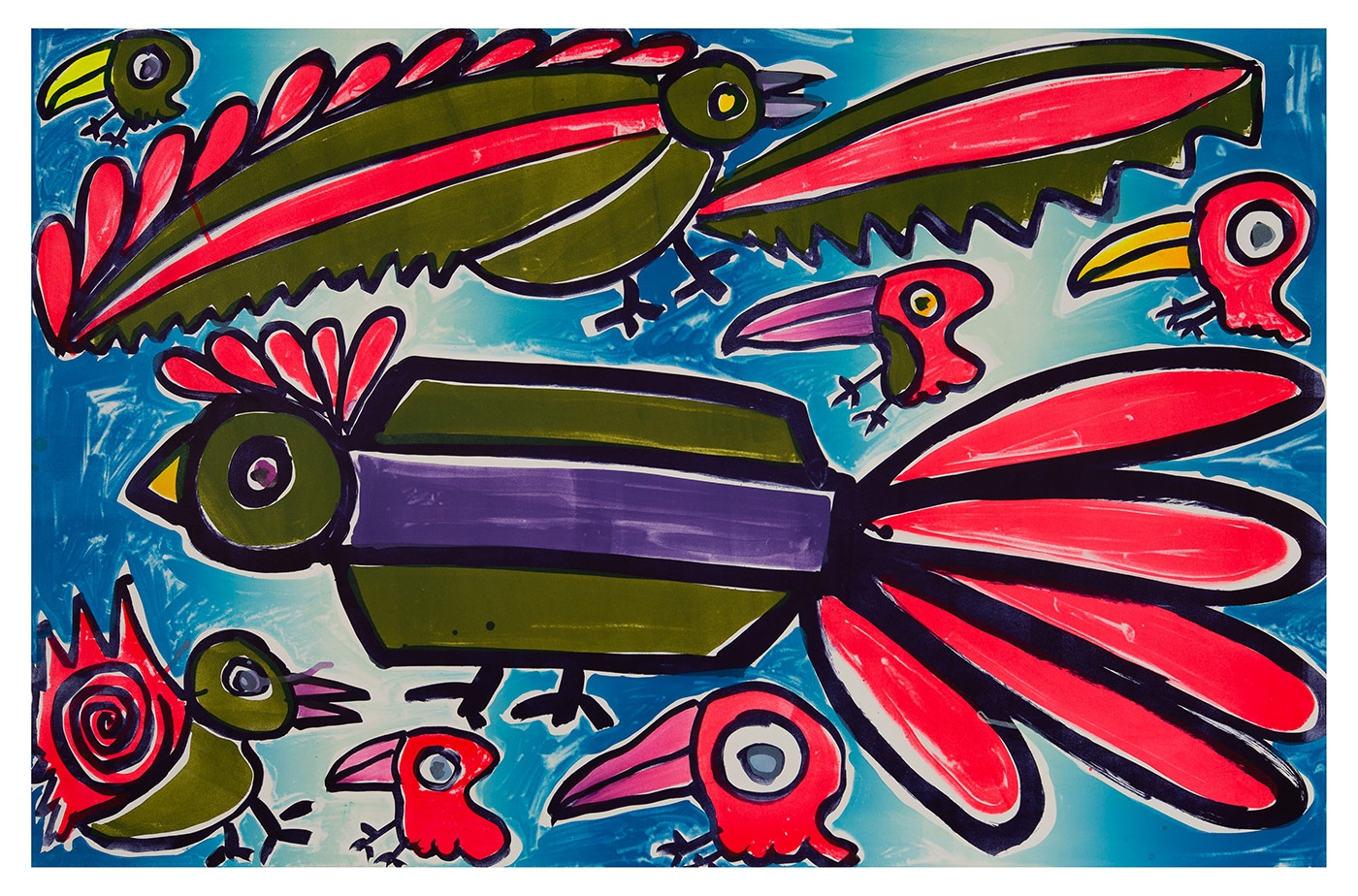 Represented by the influential CANADA Gallery, Katherine Bernhardt is a key player in New York's contemporary painting scene. She's collaborated with hip-hop superstar Drake, painted a swimming pool in Miami, created a public mural in LA, and runs her own Moroccan carpet import business. Bernhardt's recent solo shows include the Modern Art Museum of Fort Worth, Contemporary Art Museum St. Louis, Lever House New York as well as European solo exhibitions at Xavier Hufkens, Brussels and Carl Freedman, London. Bernhardt was born in St Louis, Missouri, in 1975. She lives and works in Brooklyn, New York.