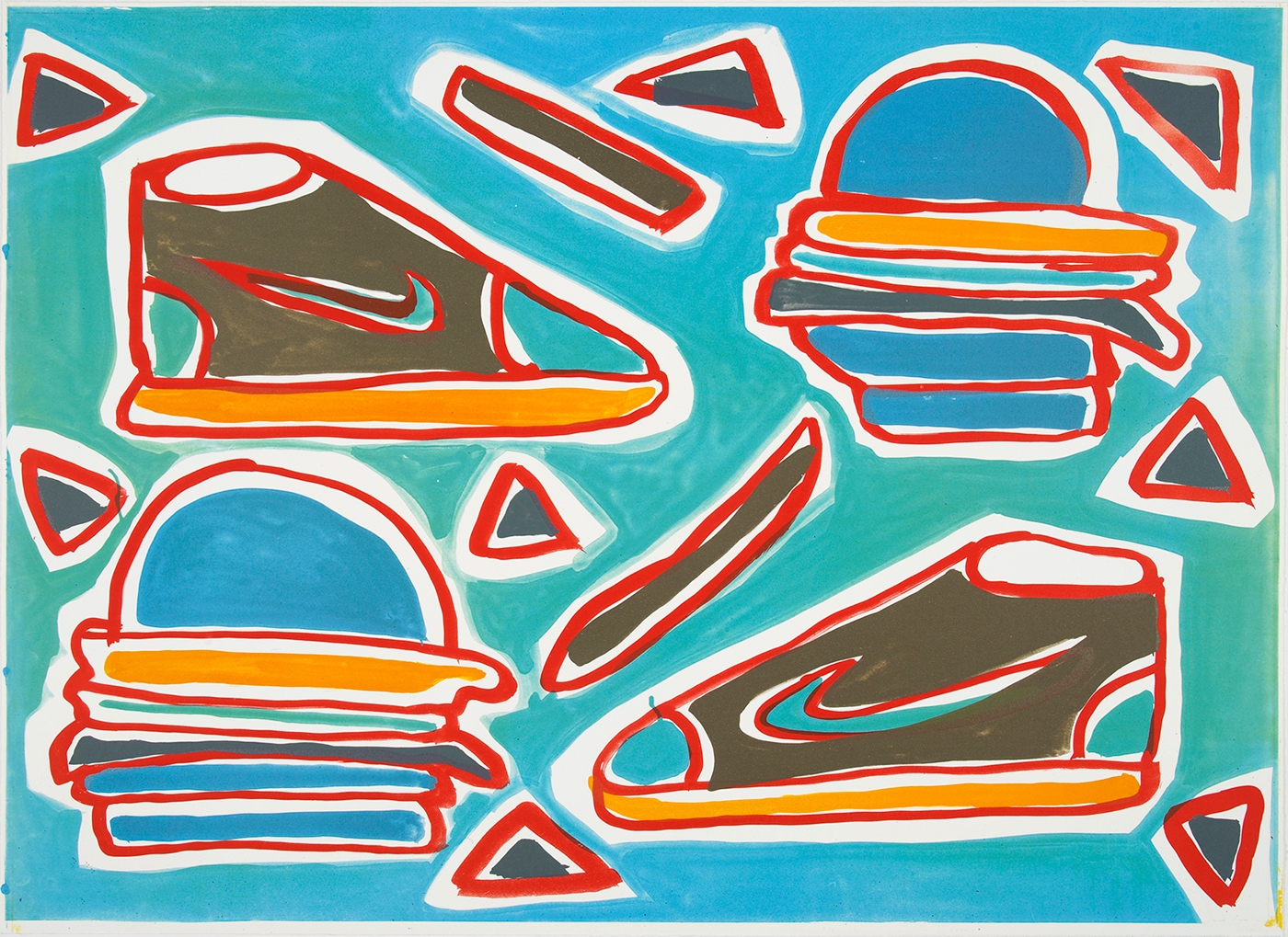 The objects featured in Katherine Bernhardt’s paintings are as quotidian as it gets: batteries, Doritos, cigarettes, blenders, laptops, coffee makers, burgers, Nikes. The stuff that gets you going and keeps you going. Gregarious and brash, they are at once effortless and carefully balanced, predicated on the classic composition of the grid while working Warhol’s maxim of ‘liking things’ then painting them. An array of objects are first traced out with fast lines of bright spray paints. The shapes created are then loosely filled with various densities of acrylic paint, varying from straight out of the tube to watery washes. Full-bodied and electric, her palette is a harmony of opposites, such as day-glo pink butting up happily against shadowy brown and ochre-orange. None of her shapes – which follow a basic circle, square, triangle or rectangle form – overlap or dominate the other. It’s a non-hierarchical schematic, representative of day-to-day life as found, sold and bought in any typical big town or small town convenience store.