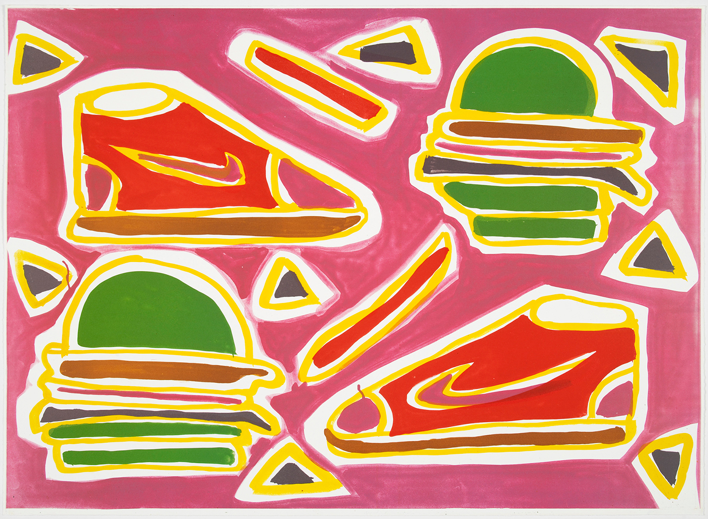 The objects featured in Katherine Bernhardt’s paintings are as quotidian as it gets: batteries, Doritos, cigarettes, blenders, laptops, coffee makers, burgers, Nikes. The stuff that gets you going and keeps you going. Gregarious and brash, they are at once effortless and carefully balanced, predicated on the classic composition of the grid while working Warhol’s maxim of ‘liking things’ then painting them. An array of objects are first traced out with fast lines of bright spray paints. The shapes created are then loosely filled with various densities of acrylic paint, varying from straight out of the tube to watery washes. Full-bodied and electric, her palette is a harmony of opposites, such as day-glo pink butting up happily against shadowy brown and ochre-orange. None of her shapes – which follow a basic circle, square, triangle or rectangle form – overlap or dominate the other. It’s a non-hierarchical schematic, representative of day-to-day life as found, sold and bought in any typical big town or small town convenience store.