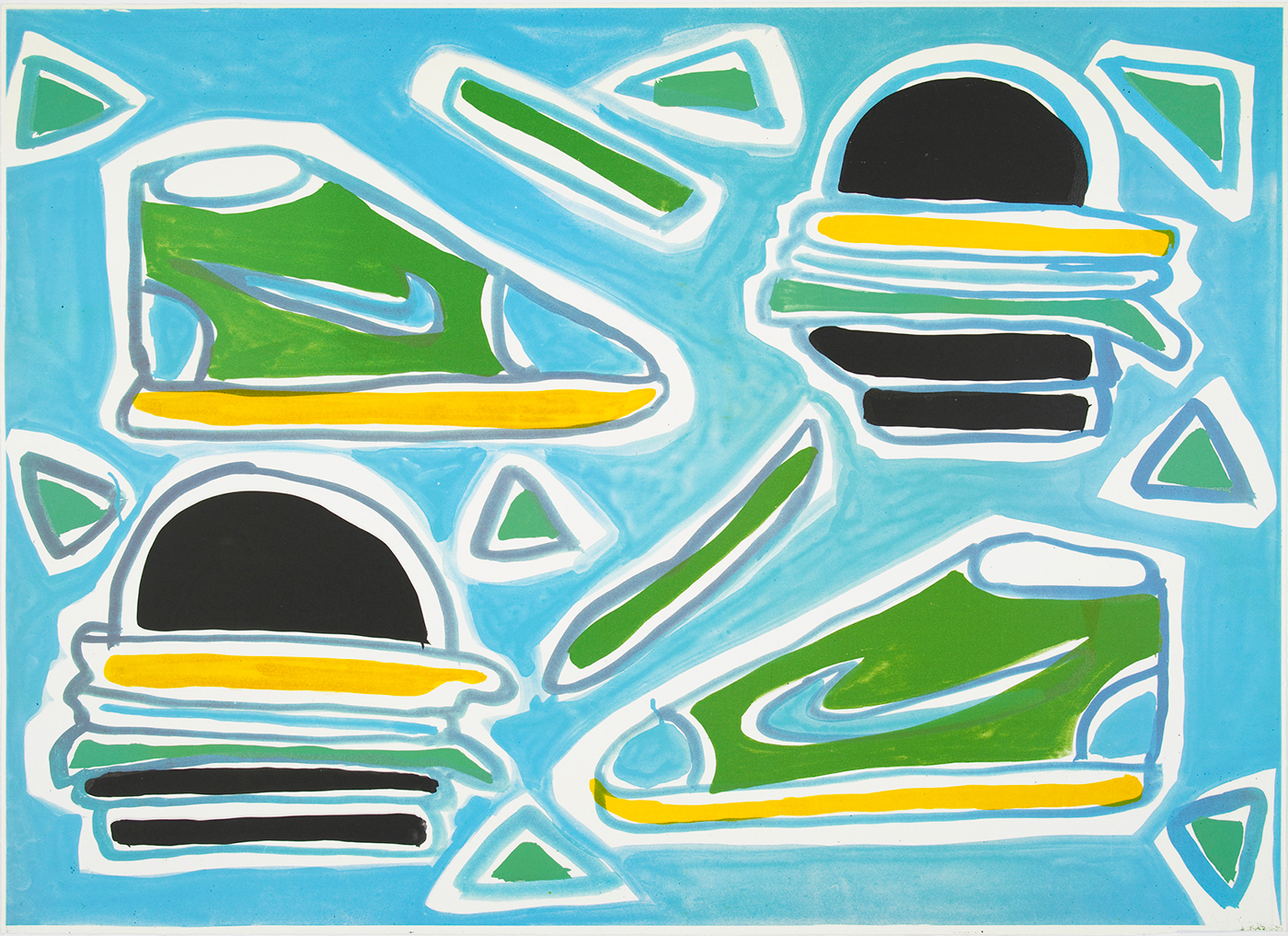 The objects featured in Katherine Bernhardt’s paintings are as quotidian as it gets: batteries, Doritos, cigarettes, blenders, laptops, coffee makers, burgers, Nikes. The stuff that gets you going and keeps you going. Gregarious and brash, they are at once effortless and carefully balanced, predicated on the classic composition of the grid while working Warhol’s maxim of ‘liking things’ then painting them. An array of objects are first traced out with fast lines of bright spray paints. The shapes created are then loosely filled with various densities of acrylic paint, varying from straight out of the tube to watery washes. Full-bodied and electric, her palette is a harmony of opposites, such as day-glo pink butting up happily against shadowy brown and ochre-orange. None of her shapes – which follow a basic circle, square, triangle or rectangle form – overlap or dominate the other. It’s a non-hierarchical schematic, representative of day-to-day life as found, sold and bought in any typical big town or small town convenience store.