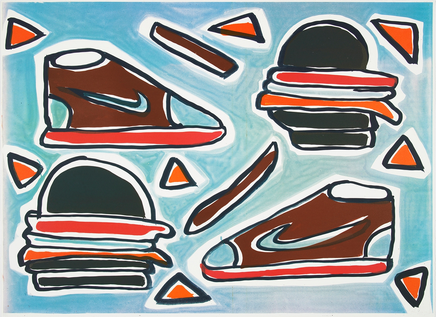 The objects featured in Katherine Bernhardt’s paintings are as quotidian as it gets: batteries, Doritos, cigarettes, blenders, laptops, coffee makers, burgers, Nikes. The stuff that gets you going and keeps you going. Gregarious and brash, they are at once effortless and carefully balanced, predicated on the classic composition of the grid while working Warhol’s maxim of ‘liking things’ then painting them. An array of objects are first traced out with fast lines of bright spray paints. The shapes created are then loosely filled with various densities of acrylic paint, varying from straight out of the tube to watery washes. Full-bodied and electric, her palette is a harmony of opposites, such as day-glo pink butting up happily against shadowy brown and ochre-orange. None of her shapes – which follow a basic circle, square, triangle or rectangle form – overlap or dominate the other. It’s a non-hierarchical schematic, representative of day-to-day life as found, sold and bought in any typical big town or small town convenience store.