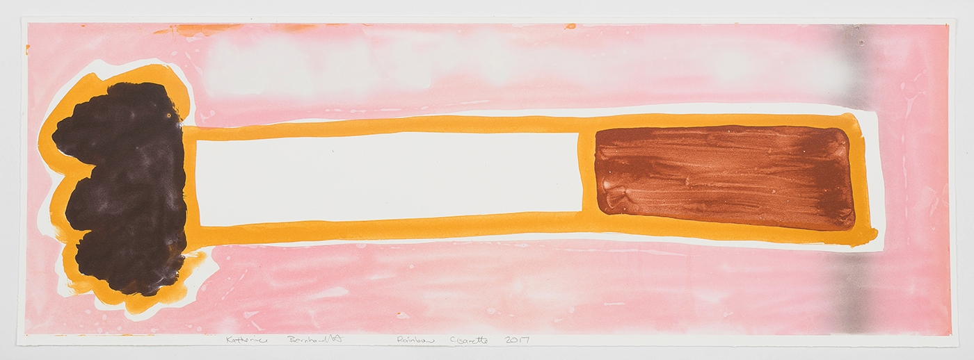 For her third collaboration with Counter Editions, Katherine Bernhardt created the 'Rainbow Cigarette' series of 100 unique lithographs. Each print has a different colour background with 'smoke' hand spray-painted by the artist in her New York studio. Printed in London with the wonderful Michael Taylor at Paupers Press, Bernhardt was attracted to the mis-registrations, blurring of colours, ink splash marks, and other unplanned incidents which occurred during the proofing process. They were of such appeal to Bernhardt that she decided to incorporate them into the whole edition. For Bernhardt this way of making a print has a close approximation to her studio practice and her instinct for making images, where chance and the accidental are favoured over the mechanical and the pre-planned.