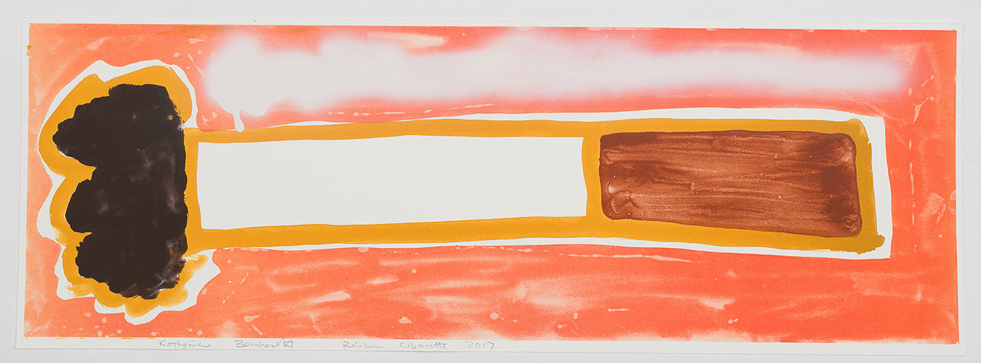 For her third collaboration with Counter Editions, Katherine Bernhardt created the 'Rainbow Cigarette' series of 100 unique lithographs. Each print has a different colour background with 'smoke' hand spray-painted by the artist in her New York studio. Printed in London with the wonderful Michael Taylor at Paupers Press, Bernhardt was attracted to the mis-registrations, blurring of colours, ink splash marks, and other unplanned incidents which occurred during the proofing process. They were of such appeal to Bernhardt that she decided to incorporate them into the whole edition. For Bernhardt this way of making a print has a close approximation to her studio practice and her instinct for making images, where chance and the accidental are favoured over the mechanical and the pre-planned.
