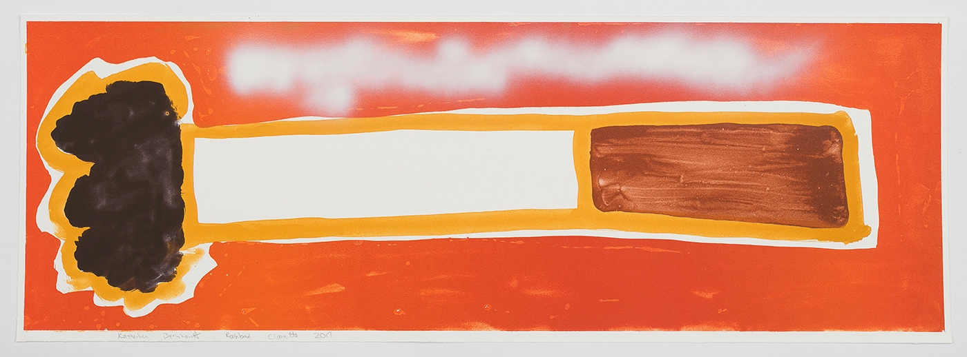 For her third collaboration with Counter Editions, Katherine Bernhardt created the 'Rainbow Cigarette' series of 100 unique lithographs. Each print has a different colour background with 'smoke' hand spray-painted by the artist in her New York studio. Printed in London with the wonderful Michael Taylor at Paupers Press, Bernhardt was attracted to the mis-registrations, blurring of colours, ink splash marks, and other unplanned incidents which occurred during the proofing process. They were of such appeal to Bernhardt that she decided to incorporate them into the whole edition. For Bernhardt this way of making a print has a close approximation to her studio practice and her instinct for making images, where chance and the accidental are favoured over the mechanical and the pre-planned.
