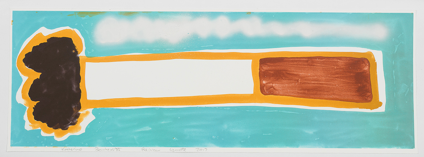 For her third collaboration with Counter Editions, Katherine Bernhardt created the 'Rainbow Cigarette' series of 100 unique lithographs. Each print has a different colour background with 'smoke' hand spray-painted by the artist in her New York studio. Printed in London with the wonderful Michael Taylor at Paupers Press, Bernhardt was attracted to the mis-registrations, blurring of colours, ink splash marks, and other unplanned incidents which occurred during the proofing process. They were of such appeal to Bernhardt that she decided to incorporate them into the whole edition. For Bernhardt this way of making a print has a close approximation to her studio practice and her instinct for making images, where chance and the accidental are favoured over the mechanical and the pre-planned.