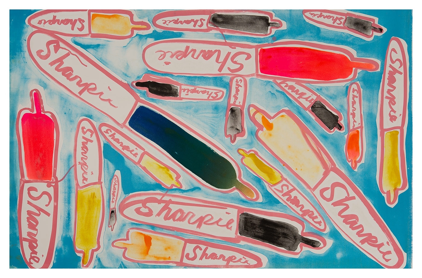 Faced with numerous colour options, Bernhardt was less attracted to any single version, and more to the mis-registrations, blurring of colours, ink splash marks, and other unplanned incidents which occurred during the proofing process. They were of such appeal to Bernhardt that she decided to incorporate them into the whole edition. She asked the printer to follow a relatively random choice of colourways, and to allow for the same unplanned mark-making as would occur if he were simply proofing the print. The end result is a series of 50 unique prints. For Bernhardt this way of making a print has a close approximation to her studio practice and her instinct for making images, where chance and the accidental are favoured over the mechanical and the pre-planned.