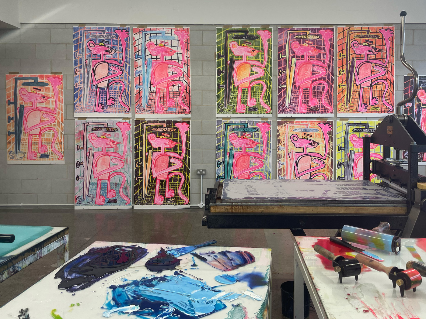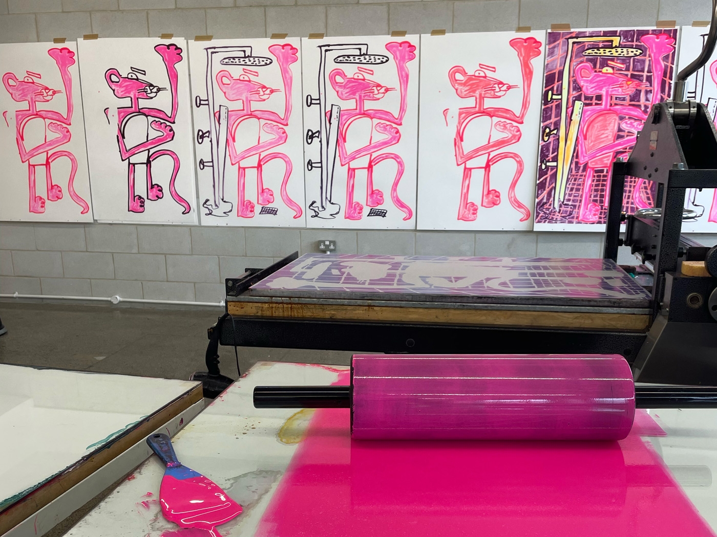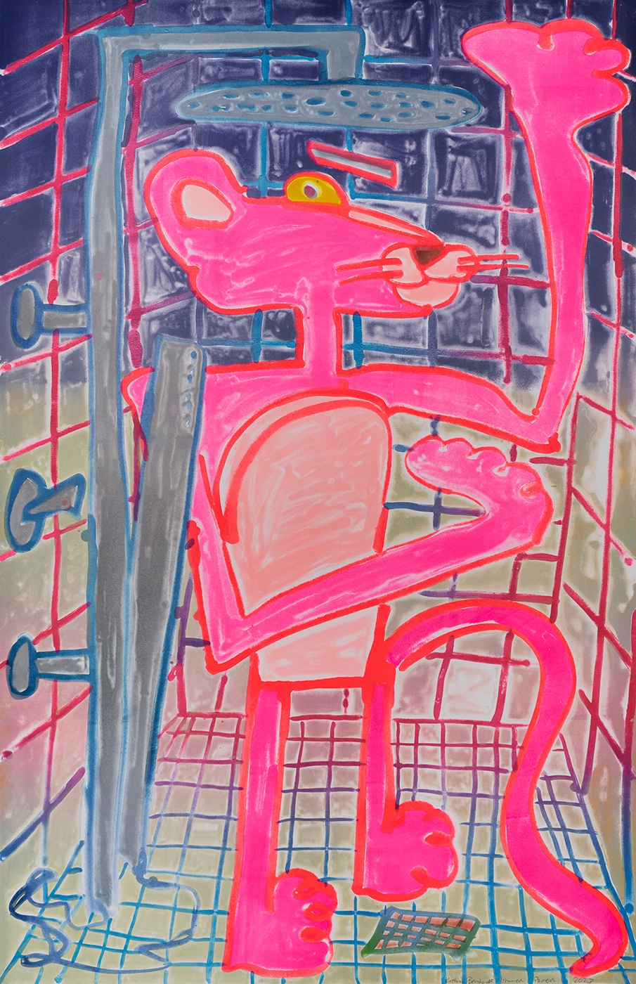 A new series of large-scale lithographic prints each one hand-pulled in a unique combination of colours in Counter Studio, Margate. Each print holds at its centre the infamous Pink Panther, a long-standing repeated motif in Bernhardt's work. In Shower Power, Bernhardt situates the cartoon character against the modernist grid of the oversized brightly coloured shower in her studio in St. Louis.