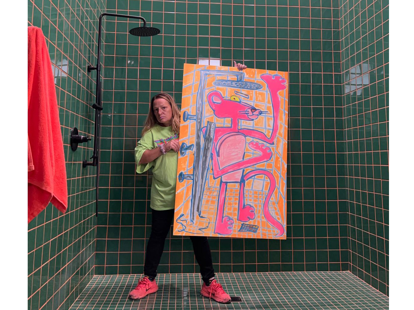Katherine Bernhardt, Shower Power (2023) Katherine Bernhardt's 'Shower Power' in production at Counter Studio, Margate. Katherine Bernhardt's 'Shower Power' in production at Counter Studio, Margate. Katherine Bernhardt with her print 'Shower Power' (2023) Katherine Bernhardt signing her print 'Shower Power' (2023) Installation View of Katherine Bernhardt's exhibition 'Why is a mushroom growing in my shower?' at David Zwirner, London, 2022.