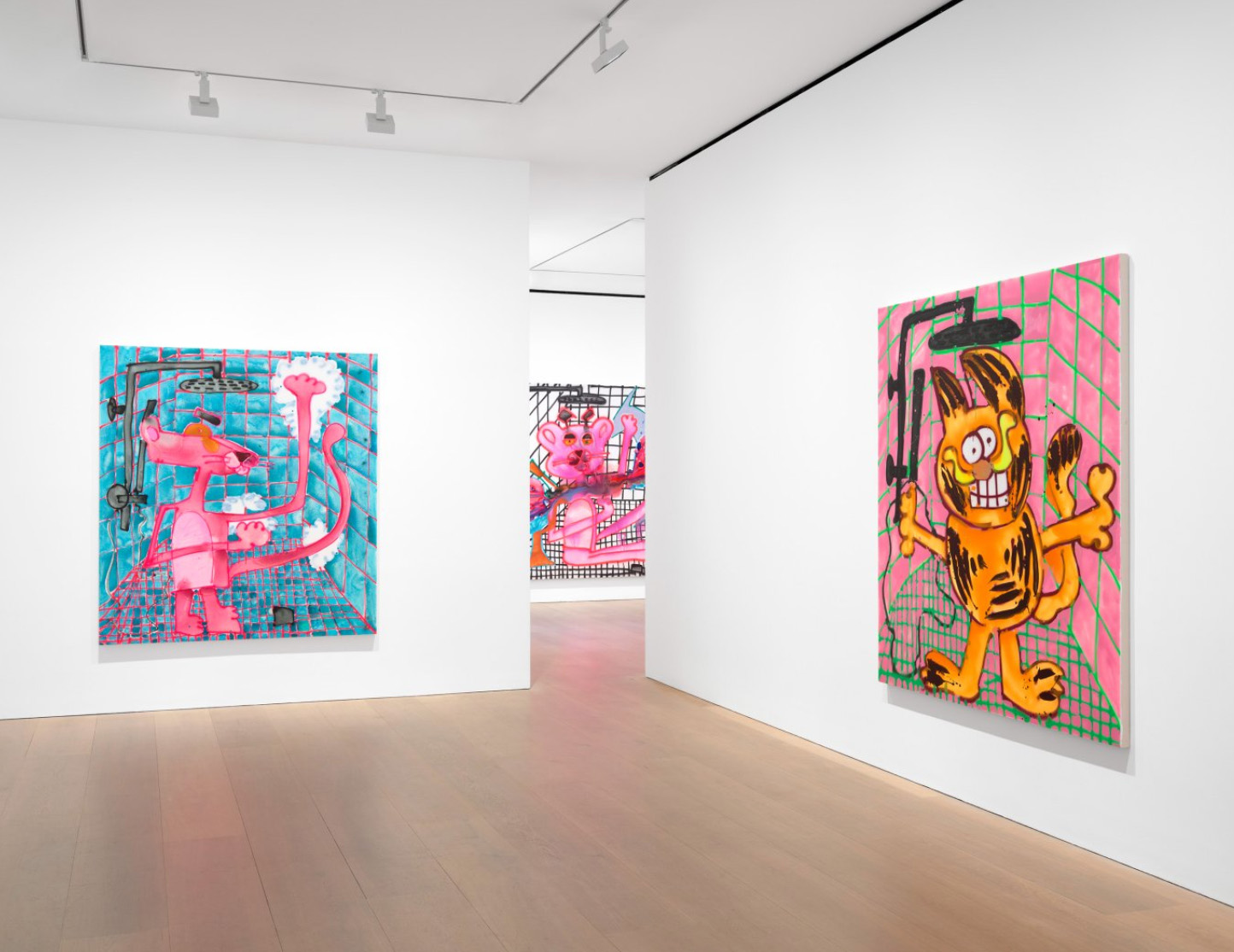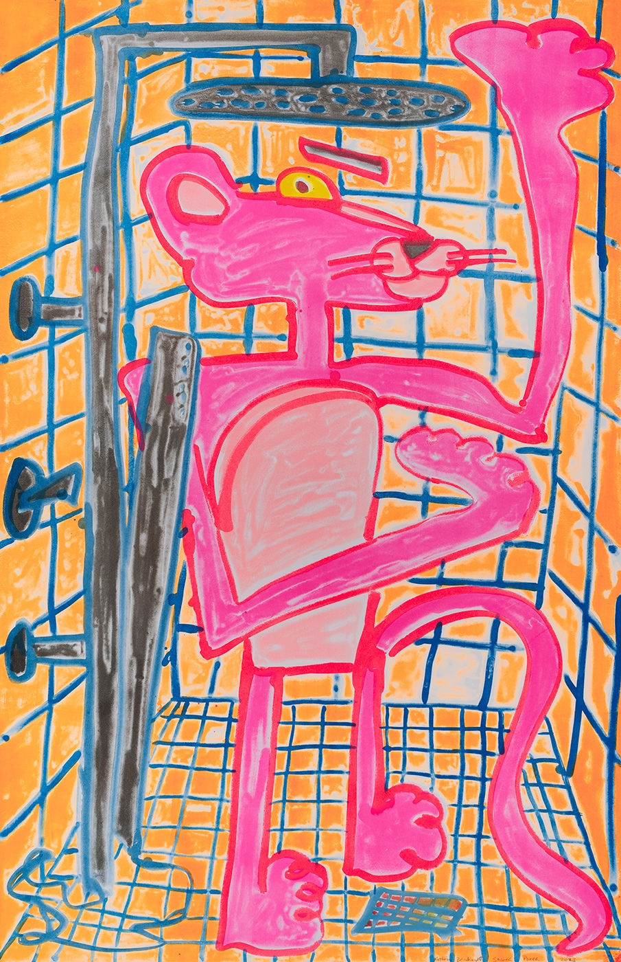 A new series of large-scale lithographic prints each one hand-pulled in a unique combination of colours in Counter Studio, Margate. Each print holds at its centre the infamous Pink Panther, a long-standing repeated motif in Bernhardt's work. In Shower Power, Bernhardt situates the cartoon character against the modernist grid of the oversized brightly coloured shower in her studio in St. Louis.