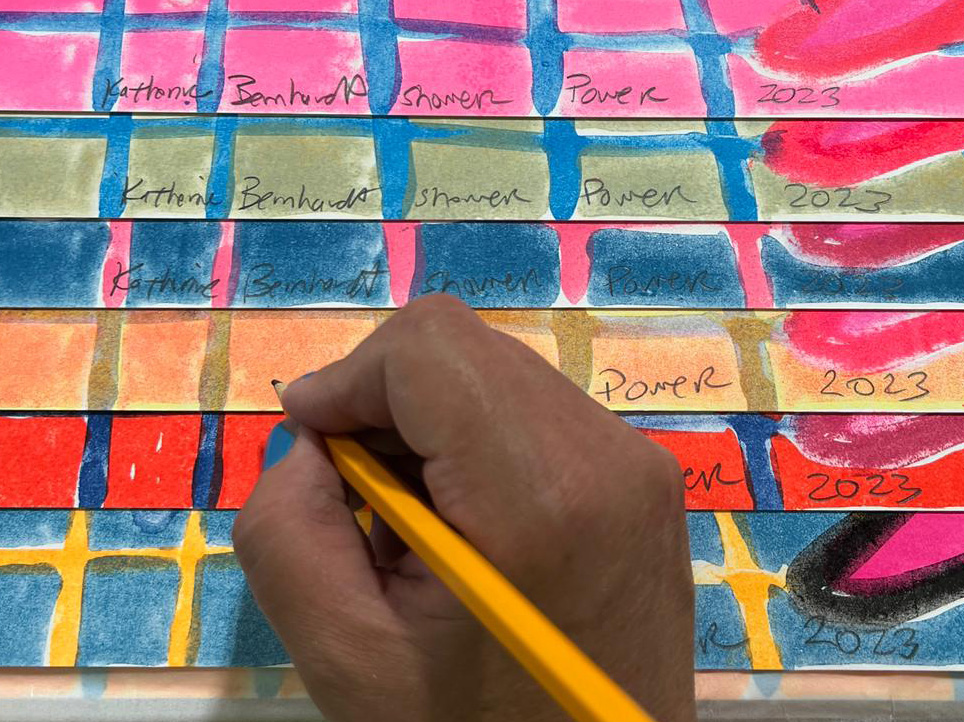 Katherine Bernhardt, Shower Power (2023) Katherine Bernhardt's 'Shower Power' in production at Counter Studio, Margate. Katherine Bernhardt's 'Shower Power' in production at Counter Studio, Margate. Katherine Bernhardt with her print 'Shower Power' (2023) Katherine Bernhardt signing her print 'Shower Power' (2023) Installation View of Katherine Bernhardt's exhibition 'Why is a mushroom growing in my shower?' at David Zwirner, London, 2022.