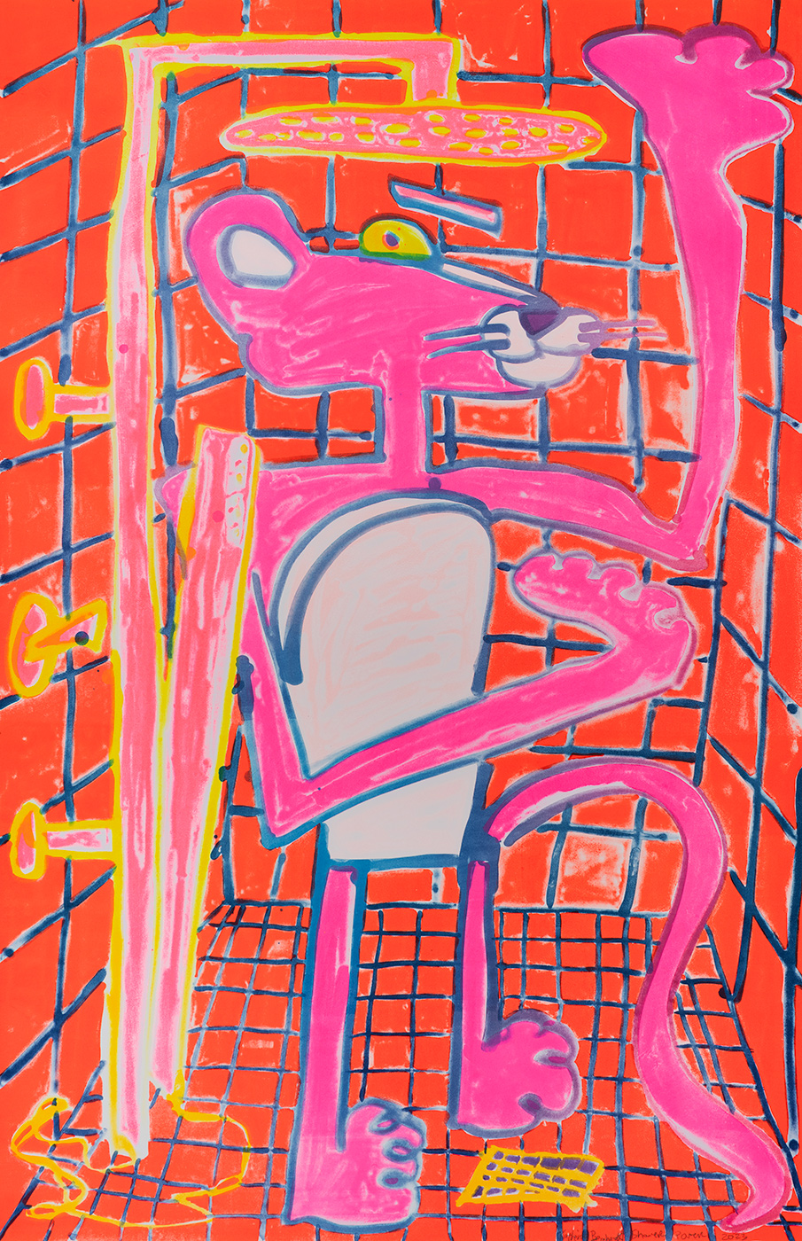 A new series of large-scale lithographic prints each one hand-pulled in a unique combination of colours in Counter Studio, Margate. Each print holds at its centre the infamous Pink Panther, a long-standing repeated motif in Bernhardt's work. In Shower Power, Bernhardt situates the cartoon character against the modernist grid of the oversized brightly coloured shower in her studio in St. Louis.