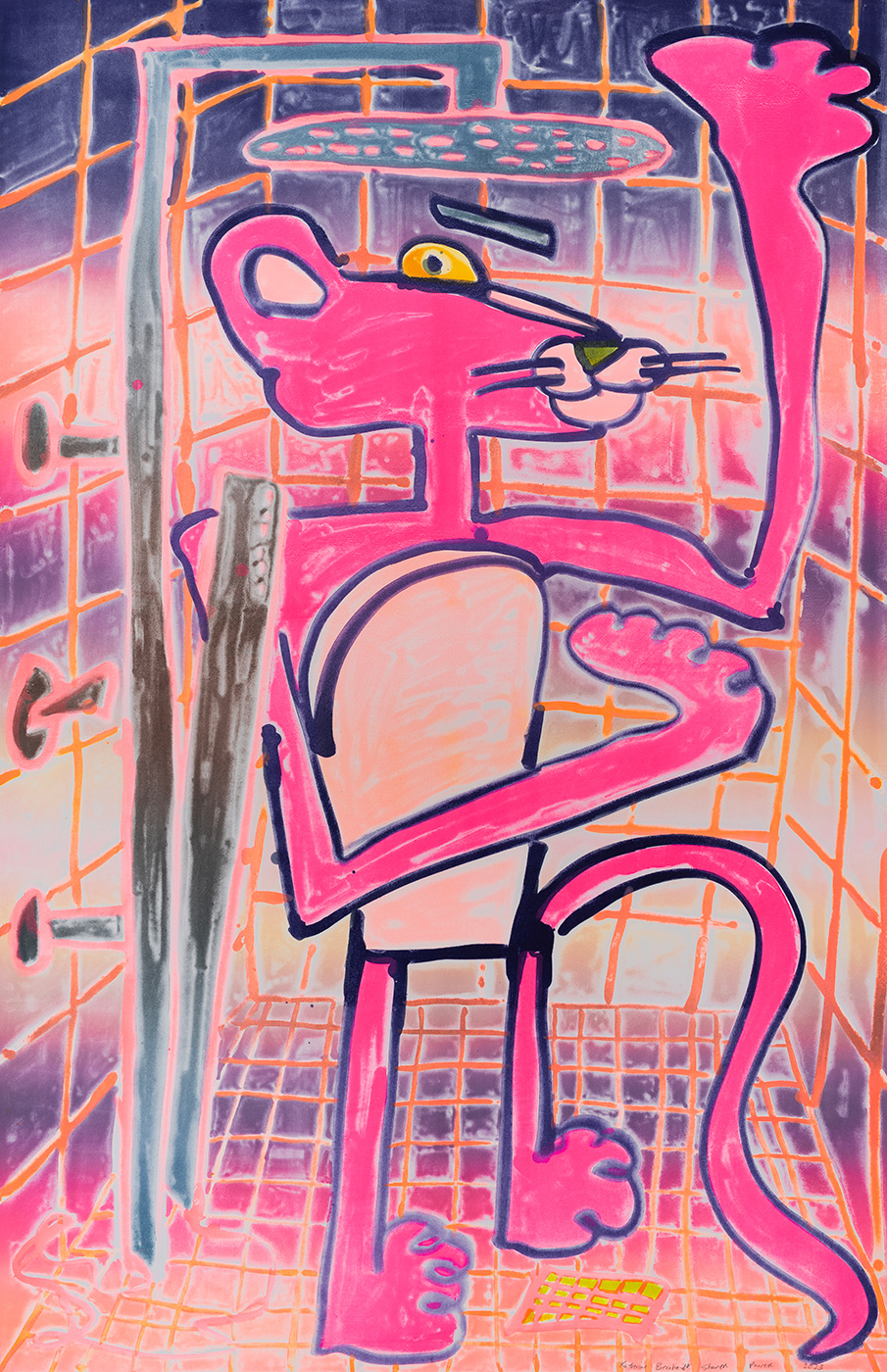 A new series of large-scale lithographic prints each one hand-pulled in a unique combination of colours in Counter Studio, Margate. Each print holds at its centre the infamous Pink Panther, a long-standing repeated motif in Bernhardt's work. In Shower Power, Bernhardt situates the cartoon character against the modernist grid of the oversized brightly coloured shower in her studio in St. Louis.