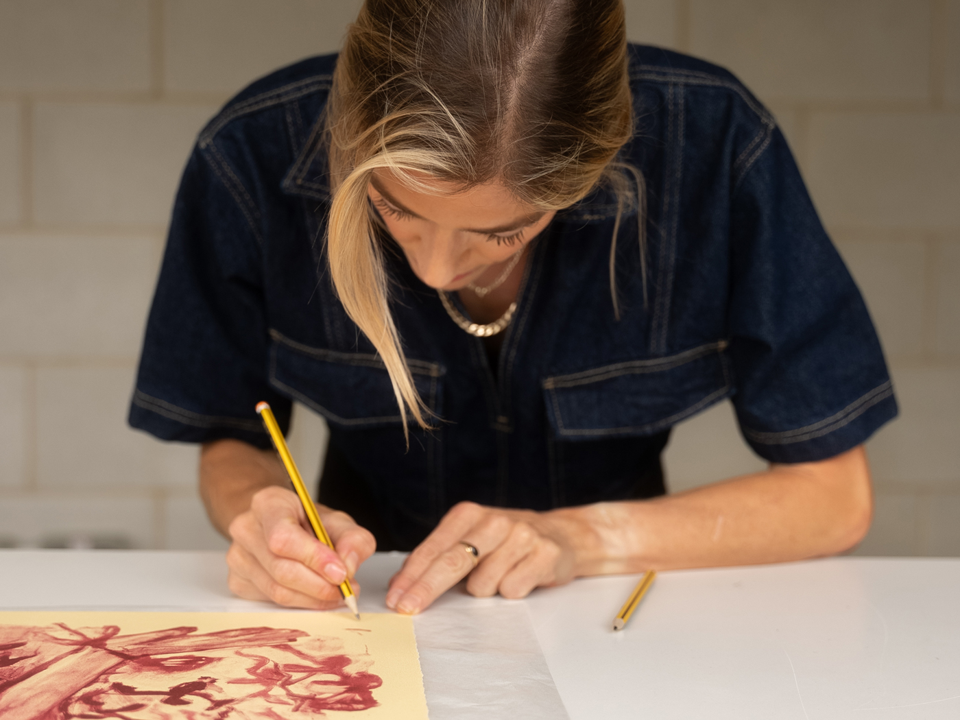 Using a heighten palette Raw conveys the intensity of the moment, as well positioning the paintings in the realm of the imaginary. Likewise, the dream-like fluidity of some areas of mark making suggest an altered state of consciousness, a deep human connectivity occurring simultaneously on a physical and spiritual plane. Photographs taken on her daily runs through local nature areas, an activity undertaken with therapeutical escapist intention, are used as source material for her background landscapes binding their confection to meaningful actualities, pulling into the paintings the remembered feeling of oneness with nature.